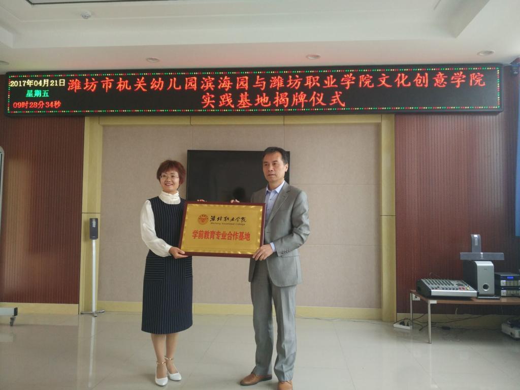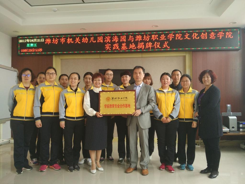 4月21日,文化创意学院学前教育专业又一校外实训基地在潍坊市直机关幼儿园滨海分园正式挂牌成立。该院党政主要负责同志及相关教师参加了校企共建校外实训基地挂牌签约仪式。该院主要负责同志与滨海分园园长共同为实训基地挂牌,签署了校企合作共建校外实训基地协议书,并就校企合作的具体事宜进行了洽谈。
