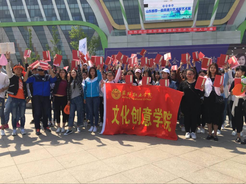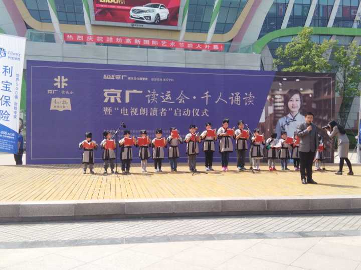 值世界读书日来临之际,4月23日上午,文化创意学院100余名学生到潍坊市人民广场参加了“京广读运会•千人诵读”活动。