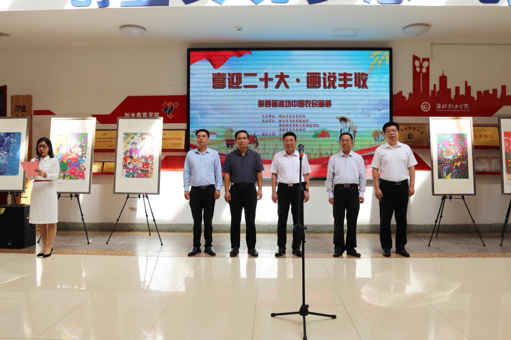 9月27日,“喜迎二十大 画说丰收——第四届潍坊中国农民画展”在潍坊职业学院举办。潍坊市农业农村局二级调研员袁增寿,学院党委委员、纪委书记郭晓辉,潍坊市书画家联谊会主席孙学科,文化山东执行主编张崇华,文化创意学院主要负责人及相关专业部分师生参加活动。