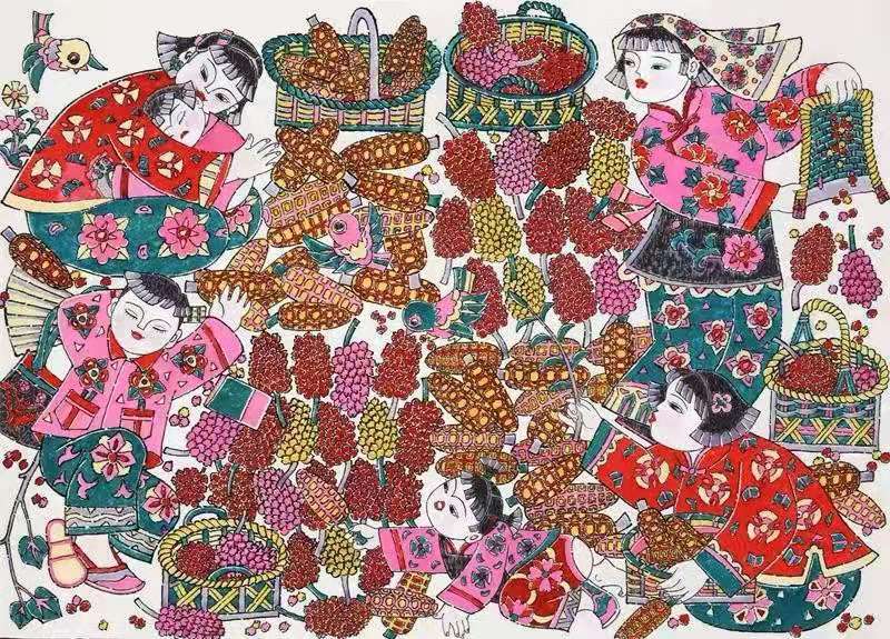 由潍坊市书画家联谊会,潍坊市美术馆,潍坊职业学院文化创意学院主办的“画说丰收——潍坊市首届农民画展”,12月5日上午在潍坊美术馆开展。